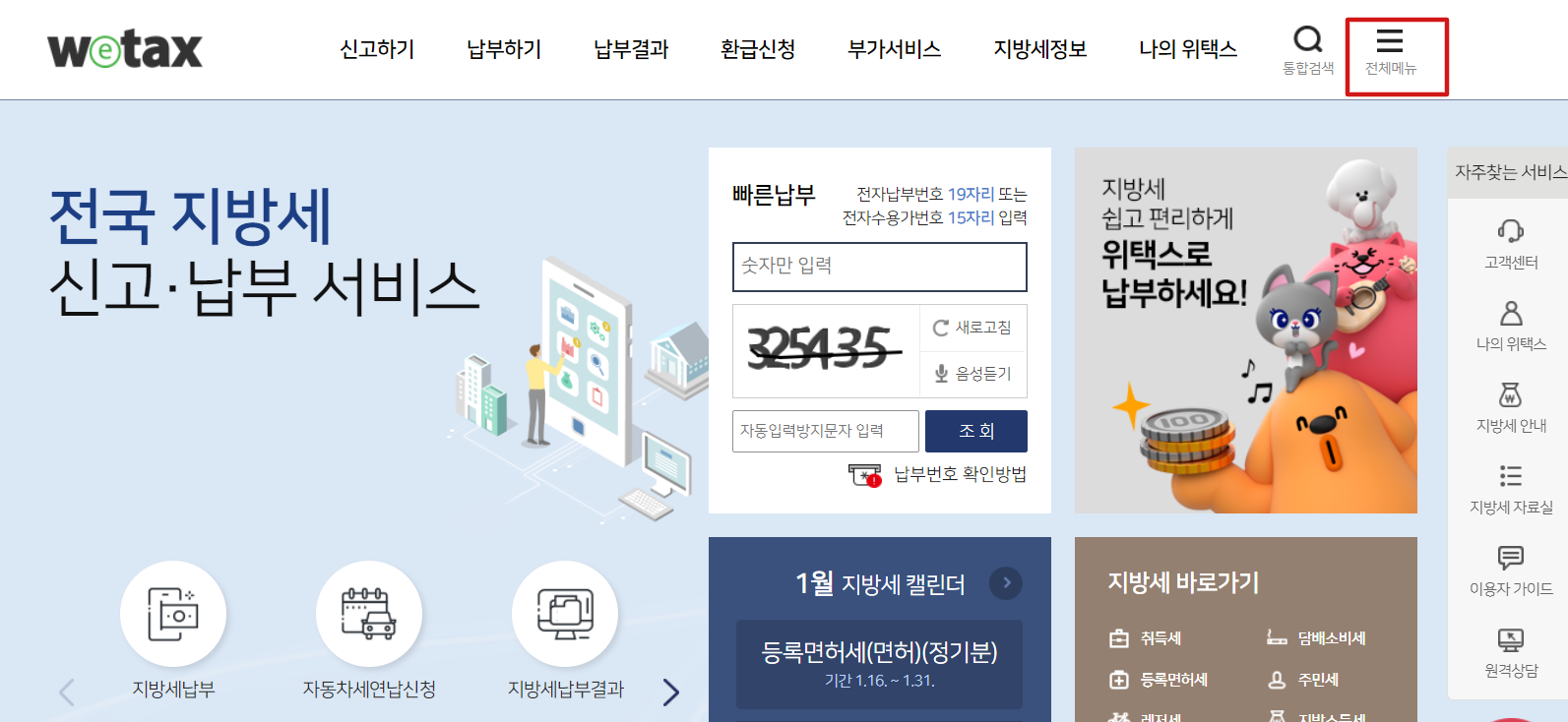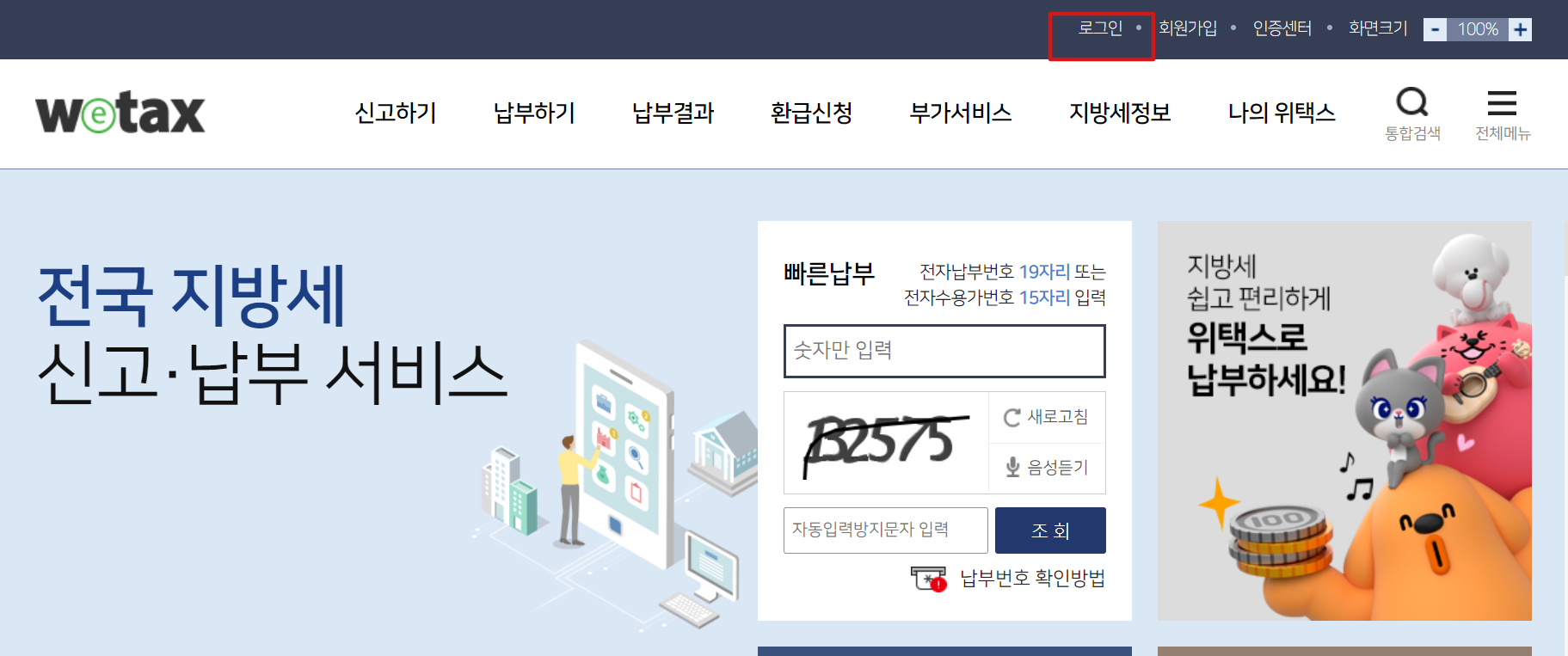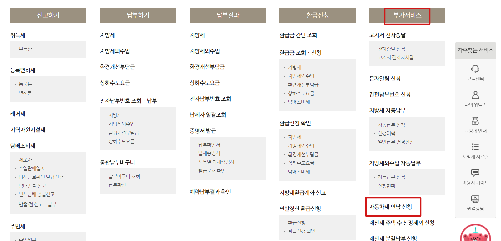 회원이라면 로그인을 하신 후 우측 상단 전체메뉴 > 부가서비스 > 자동차세 연납 신청 순으로 선택합니다. 비회원도 로그인 없이 위 경로로 동일하게 접속하여 신청 가능합니다.